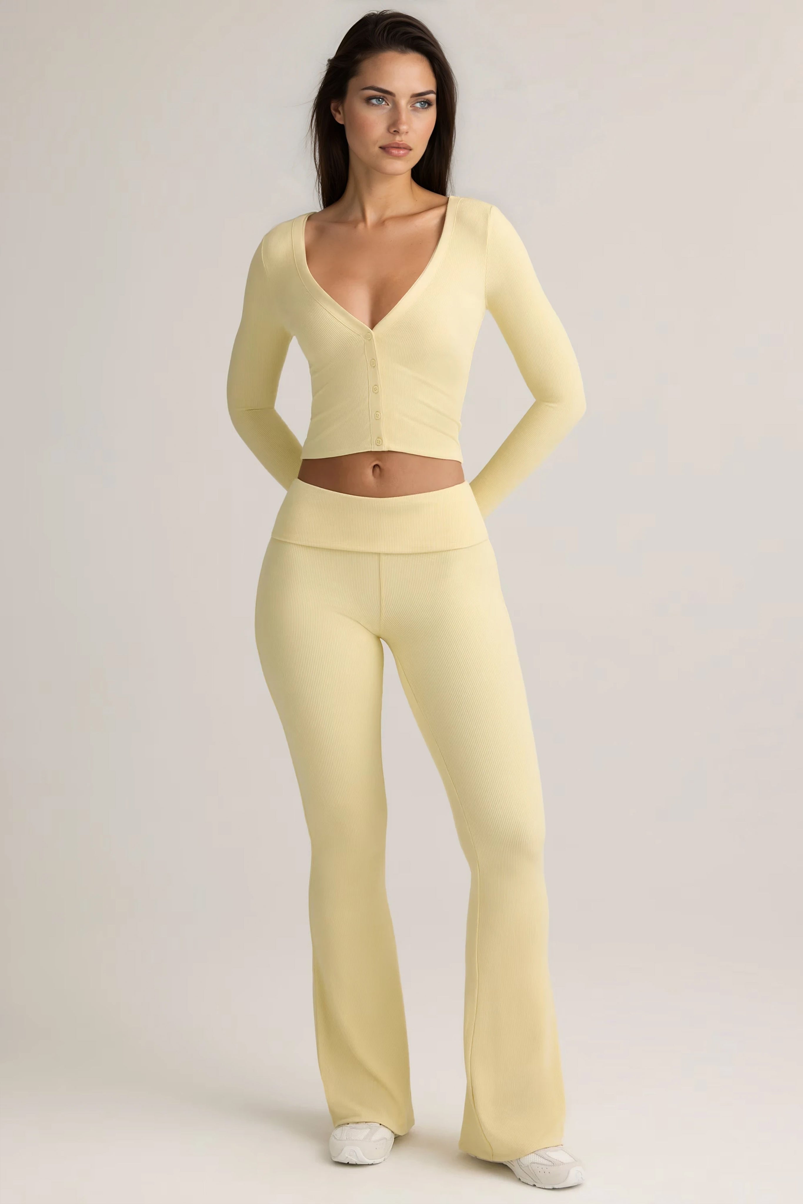 The trousers feature a mid-rise foldover elasticated waistband that adjusts to your ideal fit, while the flared leg adds a timeless silhouette. Paired with the cardigan, cut to a body-hugging fit with a V-neckline, long sleeves, and functional buttons, the set can be styled buttoned-up as a sleek top or left open for a relaxed layered look.