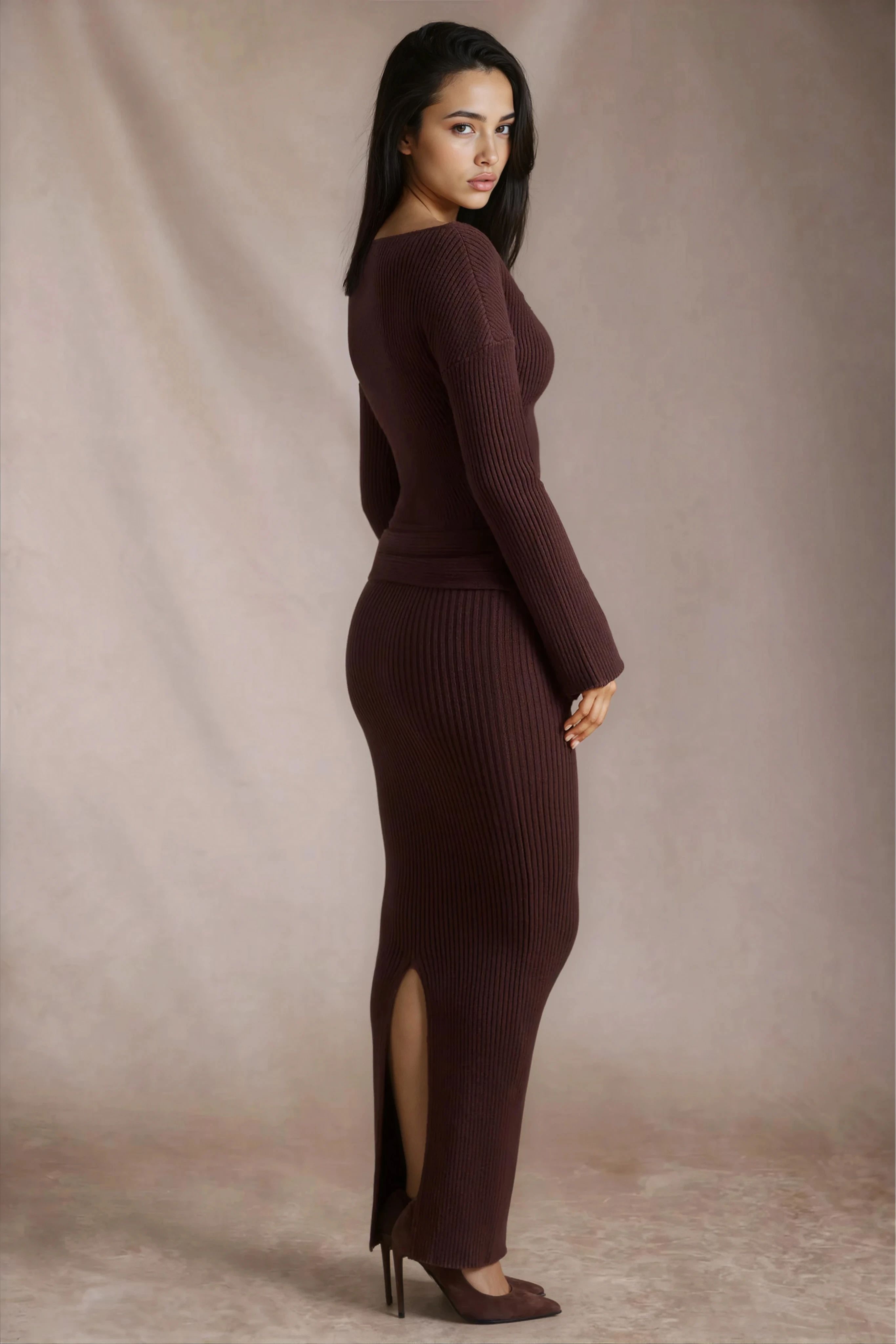 Ribbed-Knit Slash-Neck Top & Maxi Skirt Set
